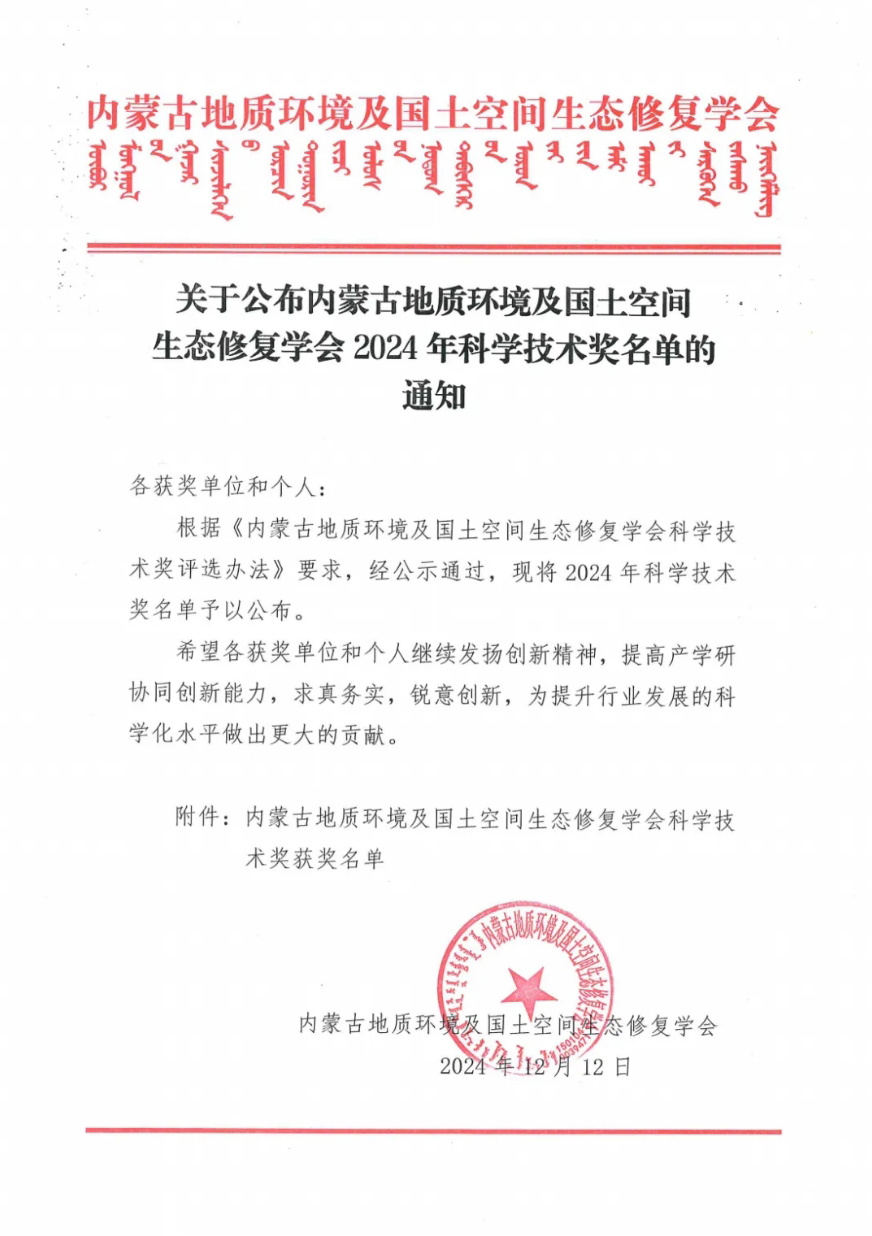荣获“内蒙古地质环境及国土空间生态修复学会2024年科学技术奖”一等奖