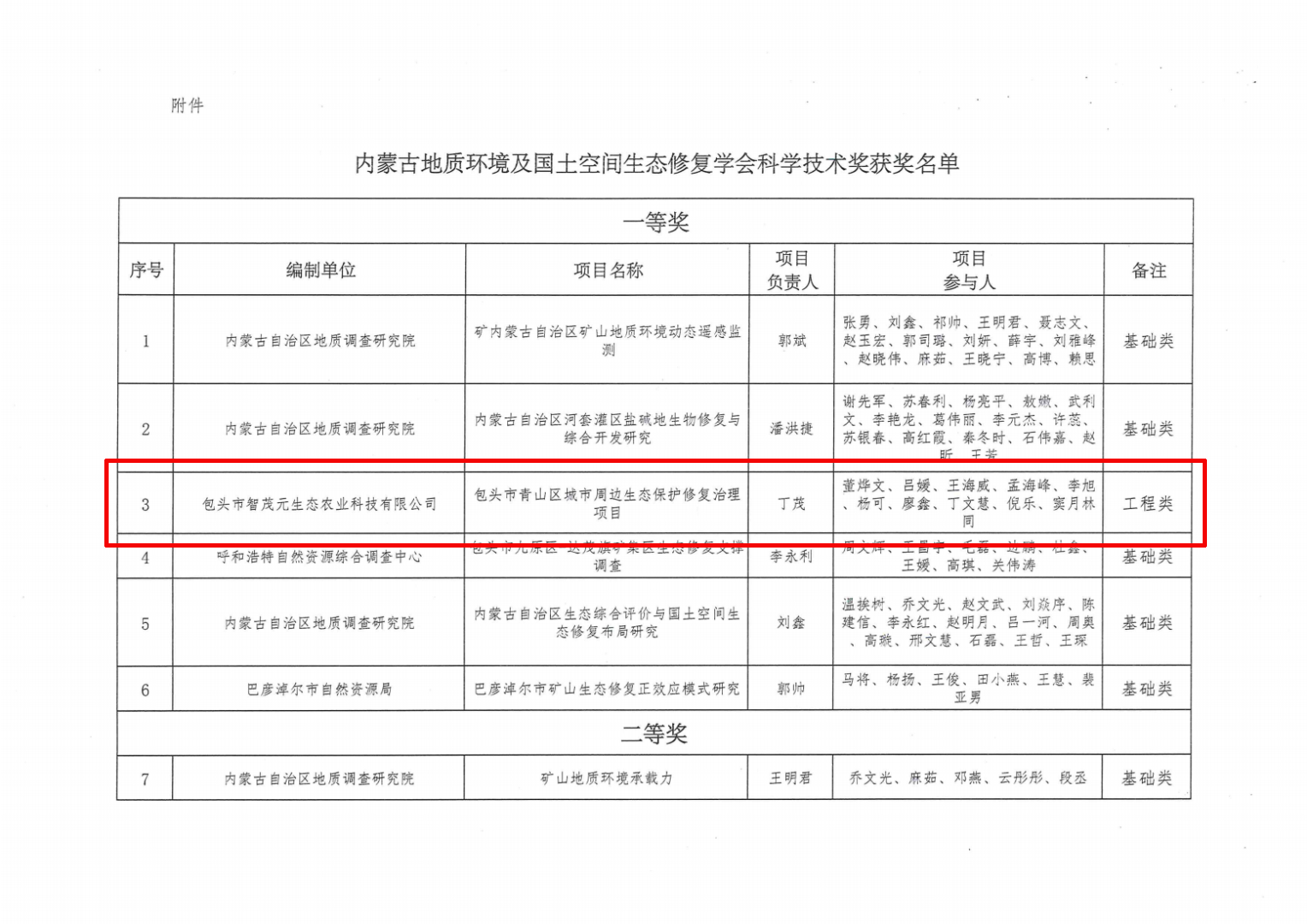 近日,公司荣获“内蒙古地质环境及国土空间生态修复学会2024年科学技术奖”一等奖,这一荣誉不仅是对公司技术创新与研究成果的高度认可,同时也彰显了我公司在生态科技领域的潜在实力与坚定信念。